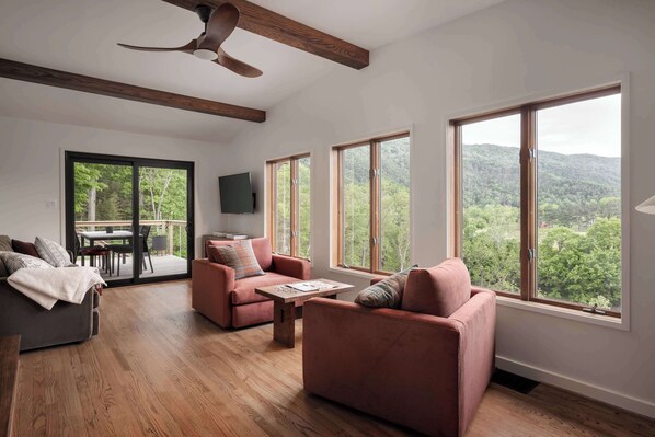 Discover "Hygge River House", a Scandinavian-inspired retreat perched above the Shenandoah River. Designed for warmth, simplicity, and connection, this four-bedroom home blends clean modern design with sweeping views and a calm sense of place. Mornings begin softly with light through the trees, and evenings end by the glow of the fire — a true embrace of "hygge" living.