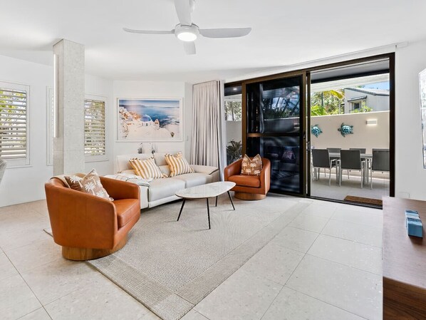 Sun-drenched open-plan living and dining area with seamless indoor-outdoor flow.