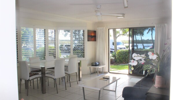 Cet appartement de 2 chambres à coucher est situé au rez-de-chaussée pour un accès facile, une salle de bains / buanderie moderne, un espace salon / salle à manger décloisonné avec beaucoup de soleil et une vue sur la rivière. Profitez du jardin directement à l'avant de l'appartement où vous pourrez vous asseoir et profiter.