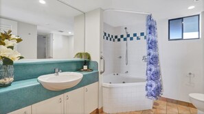 The modern interior features ducted air-conditioning, a spa bath, free Wi-Fi, smart TV & kitchenette. Everything you need for a great holiday. There is a Queen bed in the bedroom + a fold-out sofa bed in the living area (for 2 additional guests). This unit includes all of the personal linen for the Queen bed, please just let us know if you require linen for the fold out sofa bed at an extra cost.