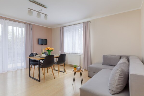 L'appartement entièrement équipé (environ 42 m²) avec balcon peut accueillir 5 personnes (4 adultes et un enfant). Il a une salle de séjour avec couchage, 1 chambre à coucher, salle de bain avec WC et douche. Les voyageurs avec enfants trouveront également dans l’appartement un lit de voyage et une chaise haute (à commander plus tôt - ne se trouvant pas toujours directement dans l’appartement).