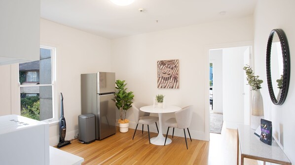Perched above street level, this elevated one-bedroom retreat balances privacy and accessibility. The queen-sized bed creates a restful haven, while a full kitchen, equipped with electric hob, oven, microwave, coffee pod machine, fridge-freezer, kettle, toaster, and cookware, ensures all the conveniences of home. The small back balcony, furnished with outdoor seating, offers a private escape for quiet coffee moments or evening reflections. A portable cooling and heating fan completes the setup for all-season comfort while in-unit laundry facilities with washer and dryer make extended stays seamless.