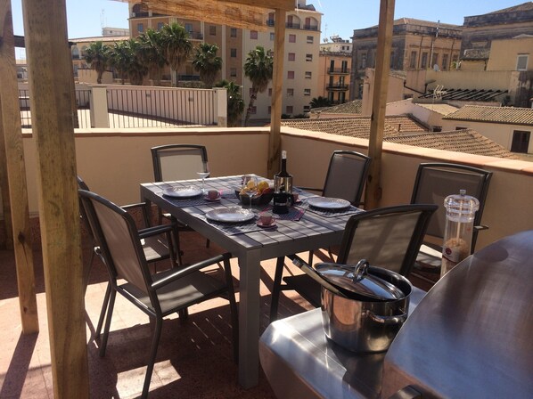 De la cuisine, vous avez un accès direct à la grande terrasse de 60 mètres carrés avec une vue sur la mer, et une vue magnifique sur les églises, les toits d'Ortigia et le volcan Etna.