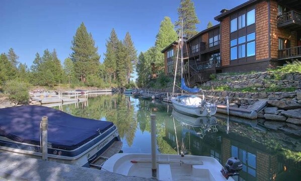 Profitez de la vue sur le port et des sons des cascades tout en vous reposant sur la grande terrasse située juste à côté du salon. La table de terrasse, les chaises, le parasol et un barbecue Weber ajoutent au plaisir de l'été Tahoe. Les escaliers de ce pont vous permettent d’explorer le port et de vous rendre à votre propre embarcation privée. *