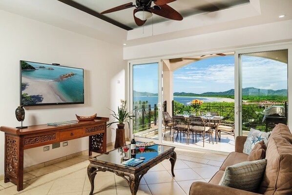 Le condo a la légère sensation de flottement d'être dans un rêve. Les sols en carrelage de couleur crème avec des détails en galets ronds s'étendent sur les deux niveaux et débordent des portes en verre sur les patios menant à l'air. La vue à couper le souffle donne une telle sensation de voler que vous vous retrouverez à la recherche de quelque chose à tenir. Ci-dessous, se trouve un jardin tropical exotique qui entoure la piscine de forme libre. De très près, la plage de Tamarindo, bordée de palmiers royaux, rejoint l’estuaire et le parc national de La Baula. La scène s'estompe au loin tandis que ciel et mer se fondent en kaléidoscope de nuages.