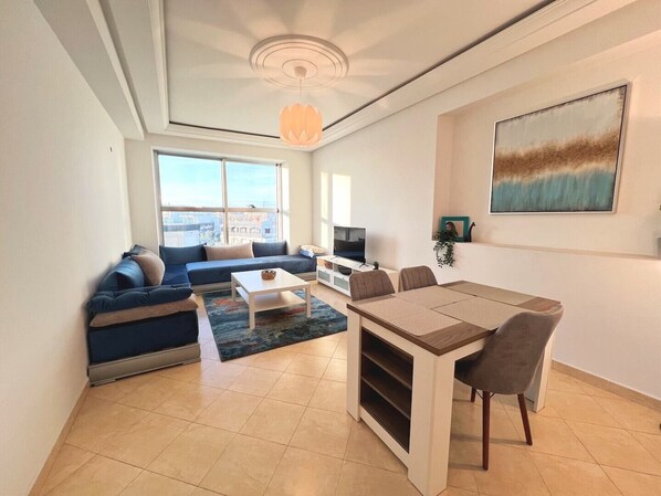 Living room with a dining area, comprising a comfortable couch, and a smart tv.
