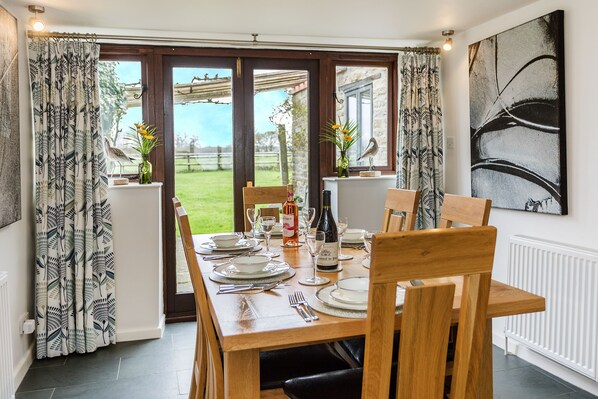 La cuisine / salle à manger moderne et bien équipé dispose d'unités de crème de style shaker de luxe des surfaces de travail en granit et un plancher d'ardoise. Il est très bien équipée, y compris un style réfrigérateur / congélateur américain. Les doubles portes ouvrent sur le patio avec vue sur les terres agricoles.