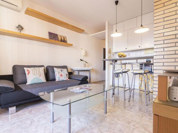 "Torrepuerto", appartement sur 2 niveaux 2 pièces 38 m2 au 2ème étage. Logement idéal pour 3 adultes. Partiellement mansardé, aménagement simple et fonctionnel: séjour/salle à manger avec 1 divan-lit (130 cm), Télévision numérique et air-conditionné. Sortie sur le balcon, sur la terrasse. 1 chambre avec 1 grand-lit (135 cm, longueur 190 cm). Cuisine ouverte (four, 3 plaques vitrocéramiques, grille-pain, bouilloire électrique, micro-ondes, cafetière électrique, Capsules pour machine à café (Nespresso)). Douche/WC. Pas de chauffage. Balcon, terrasse. Meubles de terrasse, barbecue. A disposition: lave-linge, fer à repasser, sèche-cheveux. Internet (Connexion WIFI, gratuit). Veuillez noter: logement non-fumeur. HUTT-014110 // Reg. Nr.: ESFCTU00004302700021383900000000000000000HUTT00141106