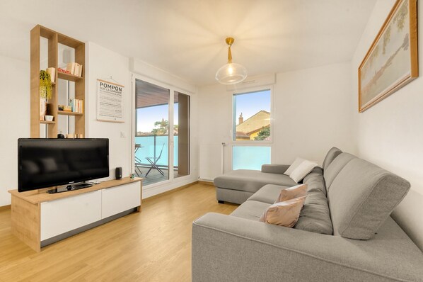 - Une pièce de vie avec un coin TV et un coin repas