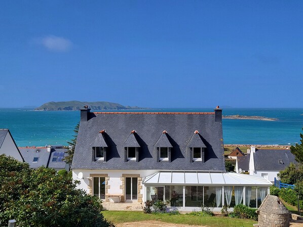 Maison bord de mer Bretagne, 8 pers, panorama mer, plage à pied, jardin, veranda