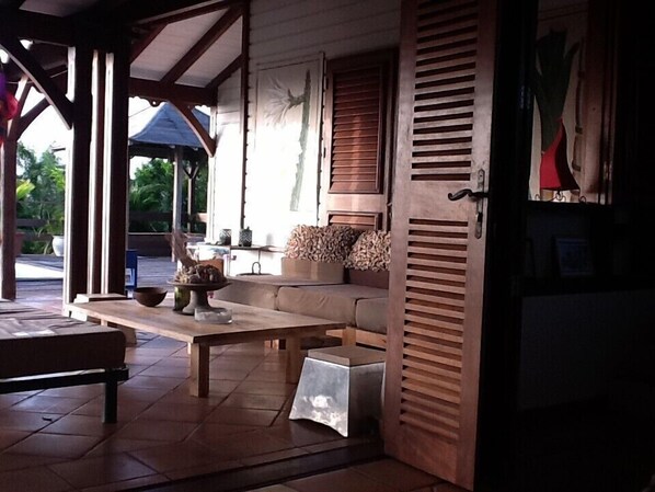 Elle bénéficie d une grande table en bois exotique pour 10 personnes , offrant une vue imprenable sur la baie invitant a profiter du BBQ en famille ou entre amis.