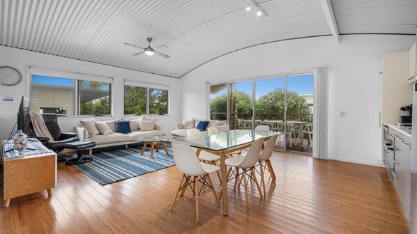 The open-plan living/dining room includes Air-Conditioning for your comfort plus two cozy couches and a plush leather recliner, perfect for settling in after a beach day. Enjoy the Smart TV and books provided for downtime, or take in the fresh air from the large balcony. The indoor dining table seats 6, while the outdoor setting accommodates larger groups.