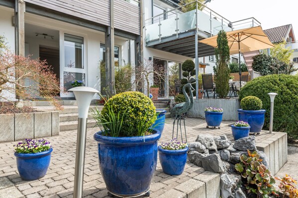 Au bord du lac de Constance, dans un quartier résidentiel calme et verdoyant, se trouve l'appartement de 60 m2 situé au rez-de-chaussée, l'"appartement de vacances Kunstmann". L'accès à l'appartement se fait par un jardin japonais joliment aménagé, mais il n'est pas accessible aux personnes à mobilité réduite.