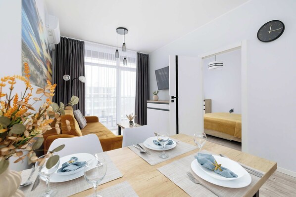 Toutes les chambres de l'hébergement Ku Morzu 1C | Seaside Apartment near the beach with a swimming pool | Parking disposent d'atouts confort comme un système de réglage de la climatisation, ainsi que d'autres services et équipements, notamment un espace bureau et une table à manger.