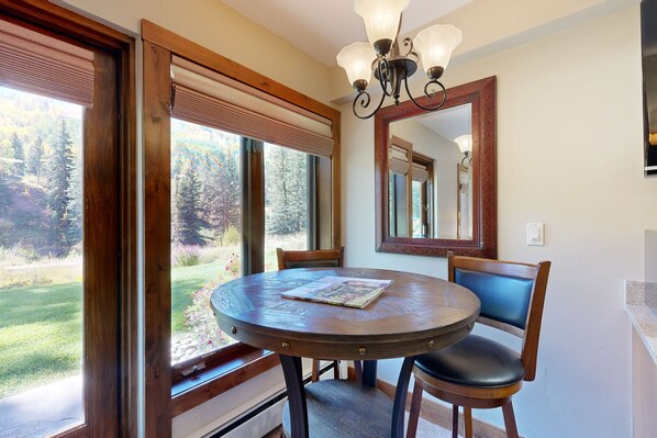 Decorated with rich colors, this studio is perfect for guests looking to relax without fuss during their trip to the mountain. The gorgeous views of Vail Mountain and Gore Creek can be enjoyed from the raised table or outside on the walk-out patio! Relax on the loveseat by the king bed, and pop in a DVD when the mood strikes. This family friendly studio includes a built-in kitchenette, as well as a Caesar Stone counter in the bathroom for a touch of luxury. Guests who are looking to book multiple locations will be excited to know this unit has a door connecting to the unit next door, providing even more space for larger groups and families. Guests can also enjoy access to shared amenities during their stay, including three hot tubs and the heated outdoor pool!
