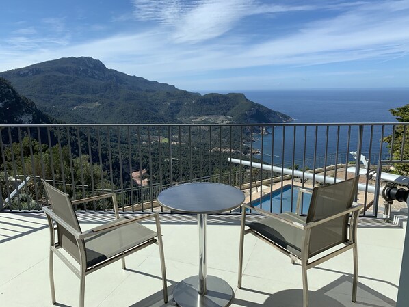 La chambre principale dispose d'un lit super-king avec une vue imprenable sur l'océan et les montagnes. Sur le balcon extérieur se trouvent 2 chaises et une table pour une contemplation tranquille!Il y a 3 armoires encastrées avec double accrochage et accrochage simple et éclairage interne avec de nombreux cintres. Une grande unité à 6 tiroirs pour vêtements pliés et 2 fauteuils. Des lampes de lecture intégrées sont installées dans la tête de lit. Les rideaux sont à l'épreuve des pannes et épais. Un ventilateur de plafond est également disponible pour compléter la climatisation si vous le souhaitez. Les fenêtres peuvent être rétractées et les volets (mur intérieur caché) peuvent être tirés à la place pour une circulation naturelle de l'air la nuit, si vous le souhaitez.