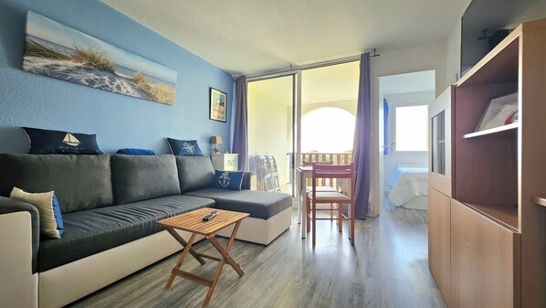 Dès l'entrée : salon avec smart TV, canapé convertible, table rabattable et chaises. Baie vitrée ouvrant sur balcon de 6 m² avec table et chaises d'extérieur. Vue mer panoramique depuis le salon, le balcon et la chambre.