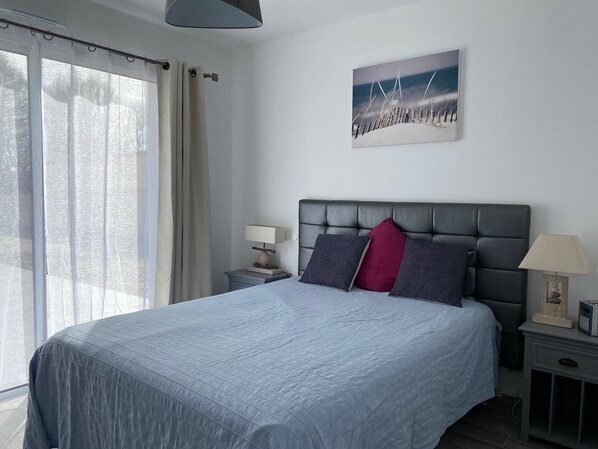 - 1 chambre parentale avec 1 lit de 140, 1 TV écran plat, placard avec cintres, dressing, SdB privative avec baignoire, sèche serviette électrique, sèche cheveux, wc séparé privatif,
