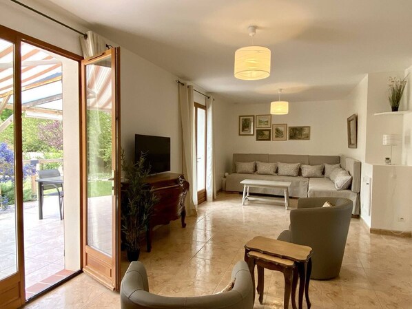 Cette pièce de vie confortable et lumineuse dispose de portes fenêtres ouvrant sur une grande terrasse carrelée avec pergola couverte et store banne, salon de jardin, table de jardin, planxa électrique et chaise longue...