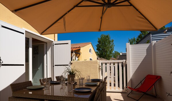 À l’extérieur, profitez d’une grande terrasse carrelée exposée plein sud, offrant calme et intimité. Elle est aménagée avec une douche extérieure, un grand parasol, une cuisine extérieure avec plancha électrique, un salon de jardin et des transats, parfaits pour les repas en plein air et les moments de détente sous le soleil méditerranéen.