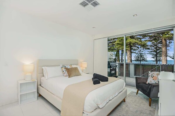 Imagine sitting on the private balcony, beverage in hand as you take in the sparkle of the sun dancing on an azure blue sea and the sound the waves make as they roll into the squalls of delight from children playing on the foreshore and the nearby playground.