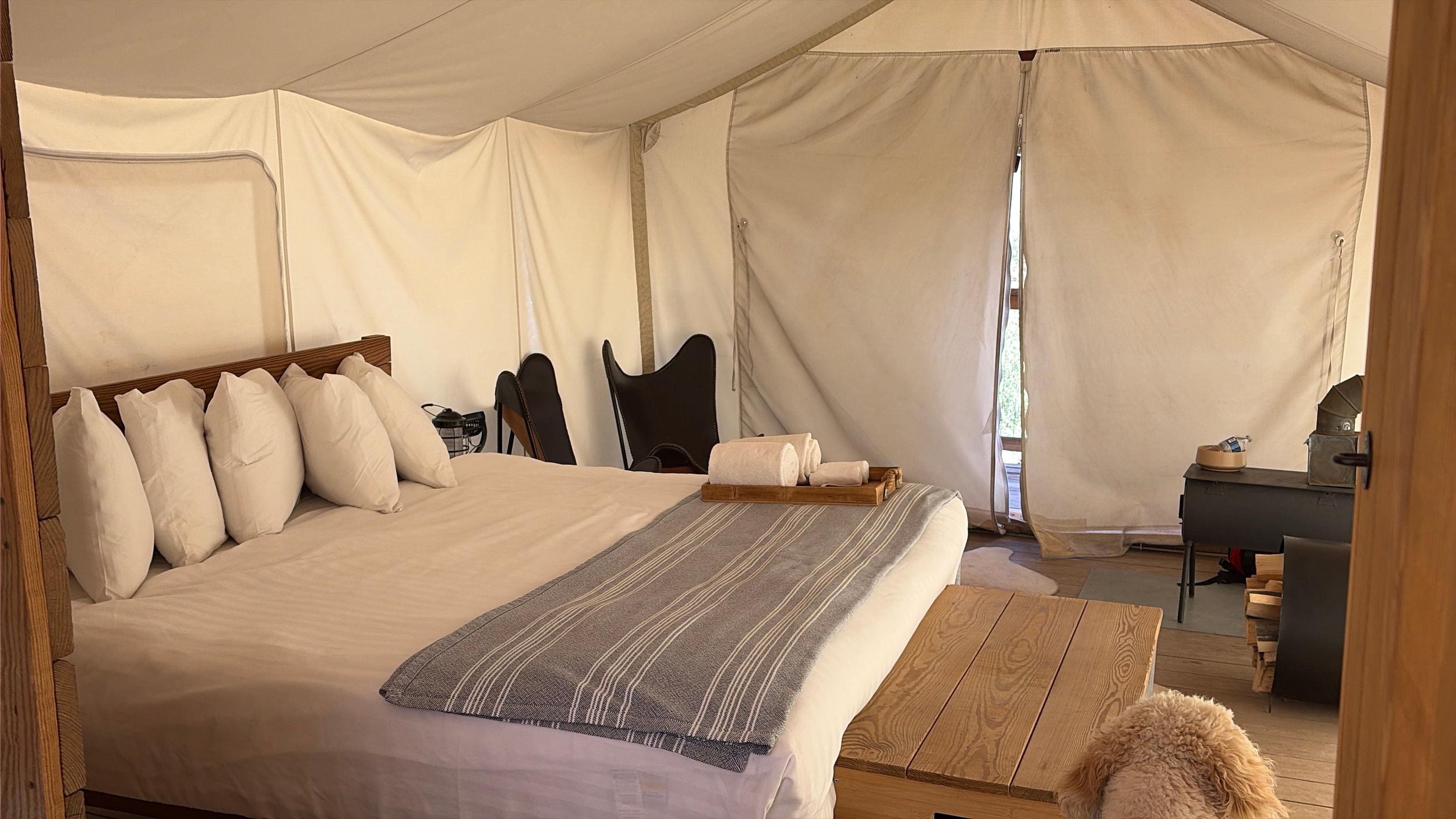 Toutes les chambres de l'hébergement Under Canvas Zion disposent de touches de confort comme une cheminée et une literie de qualité supérieure.
