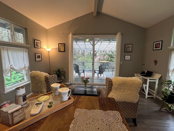 Hale Malie is a 1-bedroom, 1-bathroom private cottage that can comfortably accommodate 1-2 guests. Our interior finishes are excellent quality, with dual paned windows, and luxury vinyl plank flooring throughout. Queen size mattress, large bathroom with laundry facilities, living room and kitchen/dining area. The cottage is 500 sq. feet, providing a cozy and intimate experience for guests. As your host, we offer free, fast, and reliable internet as well as a TV in the bedroom equipped with an Amazon Fire Stick for your entertainment, though we suspect you'll want to spend most of your down time sipping a cup of coffee or enjoying a glass of wine on our spacious covered lanai to enjoy the beauty and sounds of nature.