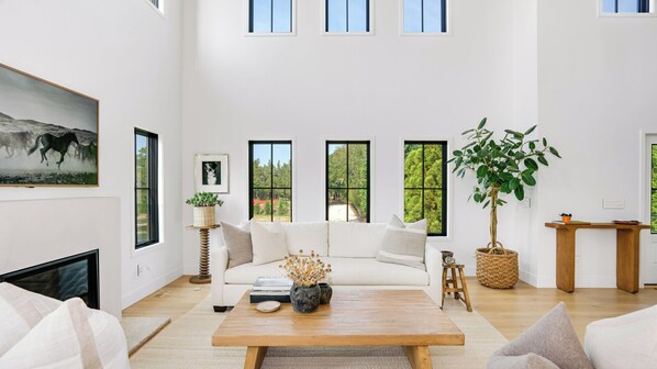 As you enter the home, you'll be greeted by an open layout that exudes warmth and sophistication. Natural light floods the space, highlighting the seamless flow from the living room to the dining area and the gourmet island kitchen. Equipped with top-of-the-line appliances and a coffee maker, the kitchen is a chef's delight. The double-height living room, complete with a cozy fireplace, creates a grand yet inviting atmosphere. For those who need to stay connected, a dedicated work-from-home space is available. Walls of windows frame the living spaces, offering breathtaking views of the surrounding nature.