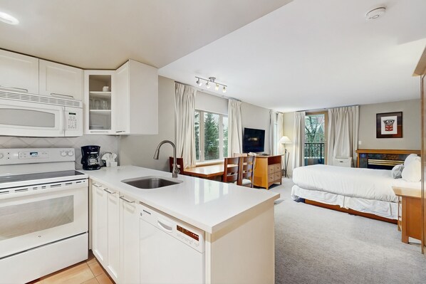 Find every comfort you could wish for at this cozy studio-style condo in Whistler Peak Lodge, located in the heart of beautiful Whistler Village! With the ski lifts, the golf course, and countless shops and restaurants within walking distance, your vacation will be one of ease and convenience. Prepare hearty breakfasts in the well-equipped kitchen, soothe your muscles in the jetted bathtub each evening, and warm your toes by the gas fireplace as your clothes get refreshed in the private washer/dryer.