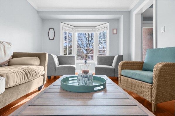 Our cozy 3-bedroom home offers the perfect retreat in Whitby. The property features a spacious living room with ample seating and a large TV, a fully equipped kitchen with modern appliances, and a dining area perfect for shared meals.
