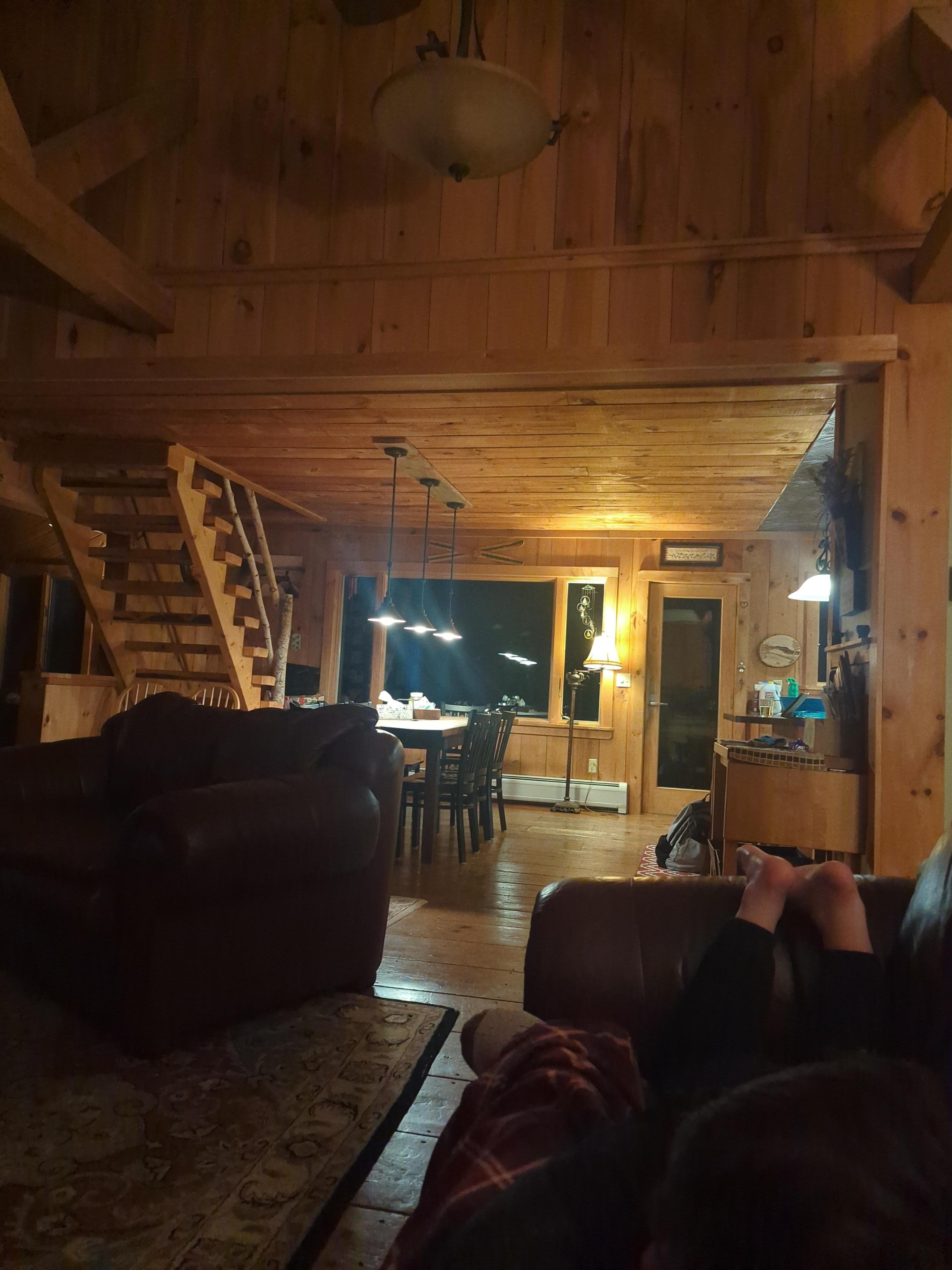 Maison a un grand plan d'étage ouvert avec des plafonds cathédrale dans la cuisine, salle à manger et salon. Les poutres en bois apparentes procurent une atmosphère de cabine confortable. Il y a une tanière avec un poêle à bois juste à côté du salon. 1 chambre est hors de la tanière, 2 chambres sont de l'autre côté de la maison, la 4ème est à l'étage principal juste à côté de l'entrée principale. Nouvellement construit 2019.