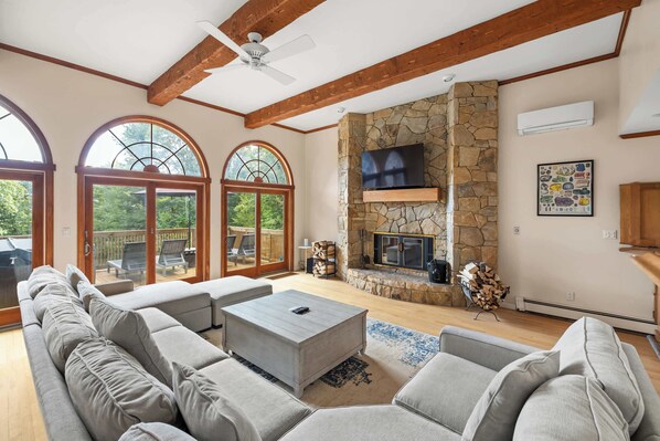 This 4,000 sqf home is both spacious and welcoming, designed for cozy gatherings and quiet moments alike. The open living area features soaring arched windows, a stone fireplace, and exposed beams. A built-in bar adds a relaxed, social touch, while the updated kitchen flows naturally into the sunlit dining area, perfect for shared meals and mountain mornings.
