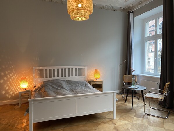 Bienvenue dans notre appartement récemment rénové de Schirdewan. Sur une superficie totale de 190 m², vous disposez de 5 chambres (4 chambres, 1 salon), 2 salles de bain (1 bain, 2 douches, 2 toilettes), une immense cuisine et des toilettes supplémentaires. Lors de la rénovation, nous avons mis l'accent sur la préservation des éléments d'origine (parquet et planchers en bois, fenêtres en bois, porte d'entrée d'origine) ainsi que des éléments modernes (sol en linoléum écologique de haute qualité dans la cuisine, douche à effet de pluie et plafond, divertissement à domicile ultramoderne)