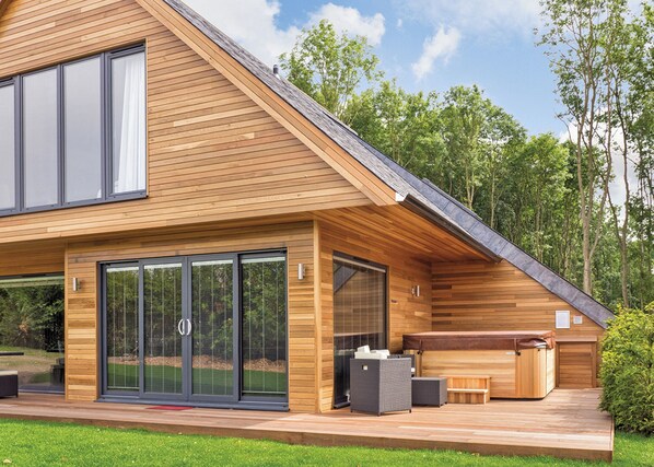 Stylish, luxury and ultra-modern two storey lodge with exquisite interior design ideal for family or friends enjoying a countryside break. The ground floor features one comfortable twin (can be linked to form a king-size) and stylish bath and/or shower. The spacious, light, stylish open-plan living area has comfortable sofas, Flatscreen TV and super stylish kitchen with breakfast bar, and spacious dining area. Open the patio doors onto large decking and enjoy the countryside views and relax in your own hot tub. The first floor features a master king-size with stylish en suite bath and/or shower, one king-size and one twin (can be linked to form king-size), all with picture windows letting the light flood in, and along with a spacious bath and/or shower. Pets allowed in selected accommodation only.