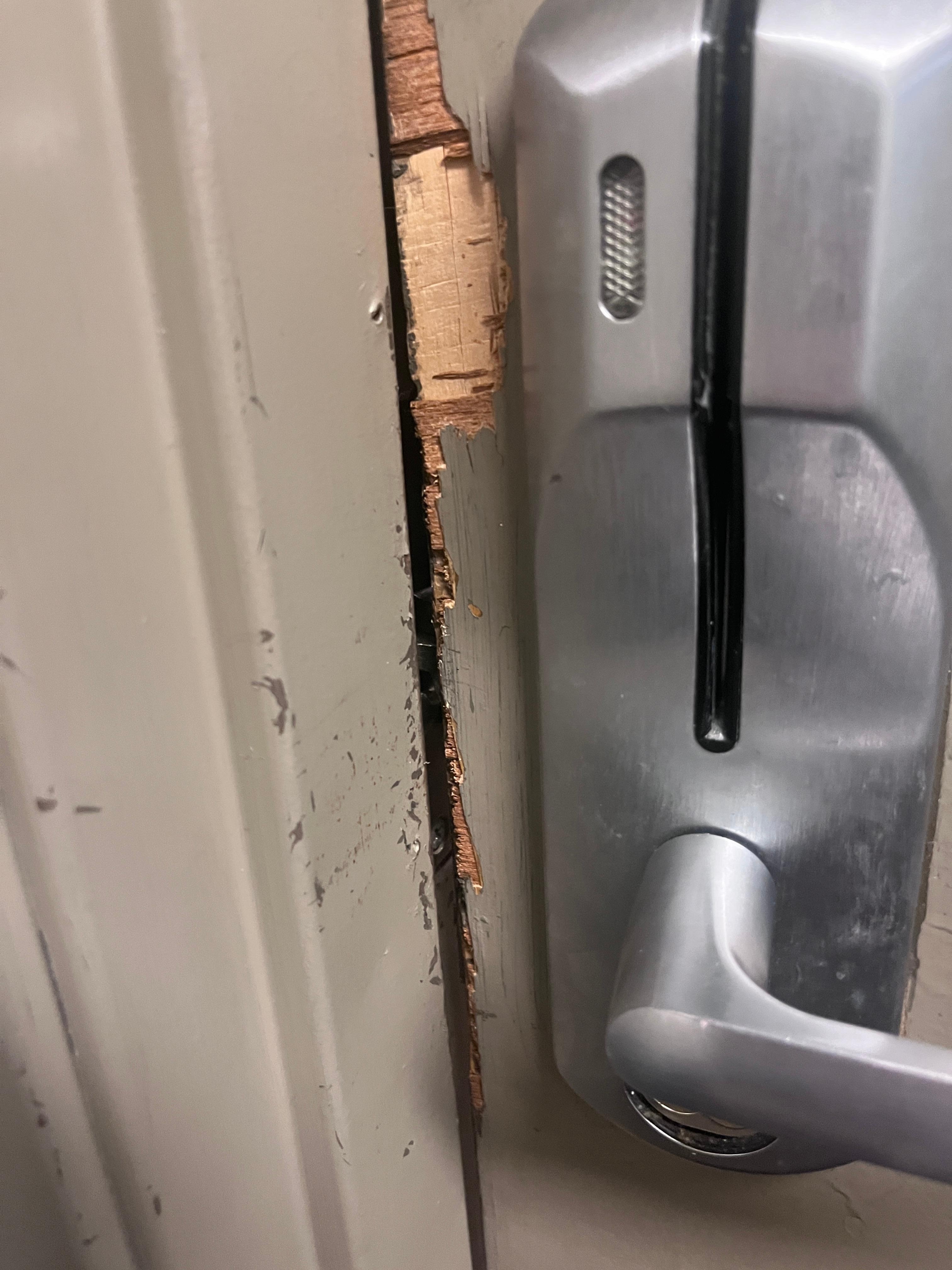 Our door had been pryed open previously . And all it took was a pen to open the door with out a key card. And inside the room had the most fluid I have ever seen on the closet mirror. No beddding just the sheet. And the floors were not cleaned.