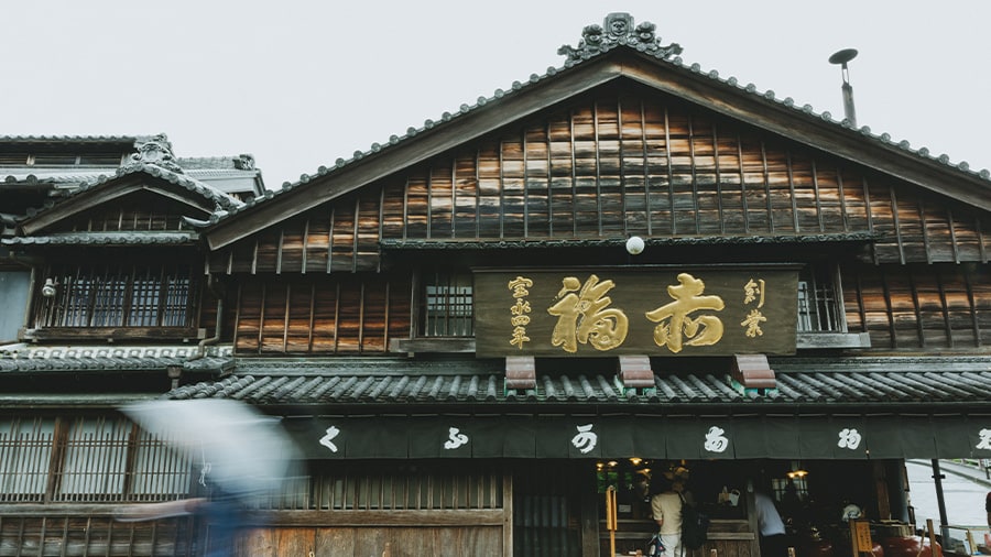Fondée en 1707, la boutique de mochi Akafuku se trouve dans la rue Oharaimachi. Découvrez la boîte signature « Akafuku Mochi » (8 boules de riz, 900 yens), où la pâte de haricots sucrée évoque la rivière Isuzu et le mochi blanc ses galets.