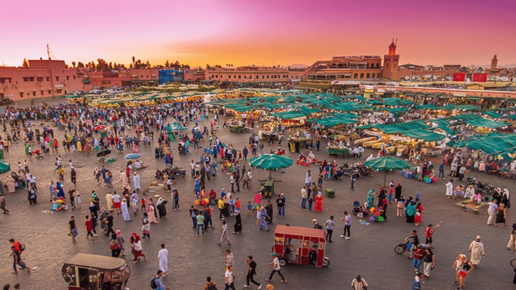 Admirez l'architecture complexe de la mosquée de la Koutoubia et explorez la place Jemaa El Fna, très animée. Admirez les charmeurs de serpents, les artistes de rue et les étals de marché colorés, tout en profitant de l'atmosphère animée.