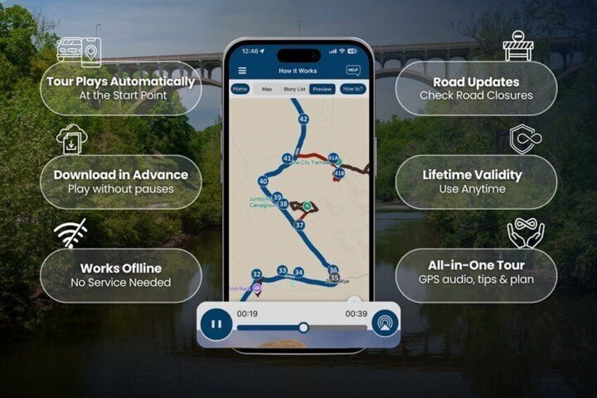 - Voyagez sans souci: Utilisez l'application de visite à tout moment, à tout jour et sur plusieurs jours. Commencez et mettez en pause la visite quand vous le souhaitez, en faisant des pauses et en explorant les excursions secondaires à votre rythme. Ignorez tout ce qui vous importe peu ou explorez le contenu bonus pour tout ce qui vous intéresse