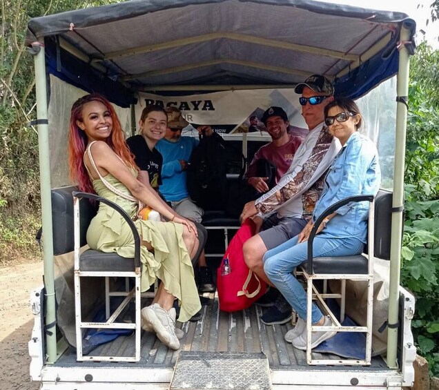 Cette expérience unique nous emmènera sur trois sommets au nord d'Antigua, au Guatemala. Le premier arrêt est ¨El Cerro de La Cruz¨ à une hauteur d'environ 5 000 pieds au-dessus du niveau de la mer, c'est l'un des points de repère et des attractions les plus célèbres d'Antigua où nous nous arrêtons pour une grande vue aérienne de l'Antigua coloniale et des villages, des volcans et de la nature situés autour de la vallée. Après avoir eu une vue aérienne rapprochée de la ville coloniale, nous remontons dans les véhicules et nous dirigeons vers la montagne El Hato en direction de notre deuxième arrêt, où nous nous arrêtons pour visiter ¨Earth Lodge¨. Il s'agit d'une plantation d'avocats et d'un gîte écologique situés dans le village de montagne d'El Hato. Nous aurons un peu de temps pour boire et manger, et vous pourrez également vous détendre dans l'un des différents hamacs. Après avoir visité cet endroit merveilleux, nous monterons dans un camion prise en charge en direction de notre dernier arrêt qui est ¨Alta Mira¨. Il s'agit d'un éco-parc unique situé dans l'une des plus hautes montagnes autour d'Antigua, à une altitude d'environ 7 600 pieds. À Alta Mira, nous faisons une courte randonnée pour profiter d'une vue encore plus imprenable sur la vallée et les volcans, avec de nombreux endroits où prendre des photos étonnantes. Ici, nous prenons le temps de visiter les célèbres « Mains », de faire des randonnées dans les bois, de faire du vélo ou de prendre des photos avec les géants qui se trouvent dans le parc. Nous avons l'habitude d'y prendre de la nourriture et des boissons. Si vous voulez quelque chose de local, demandez à votre guide. Une fois que nous avons terminé à Alta Mira, nous redescendons à Antigua.