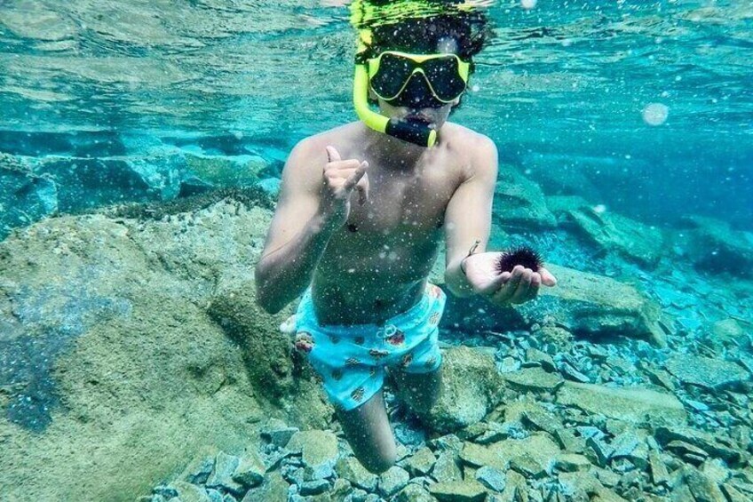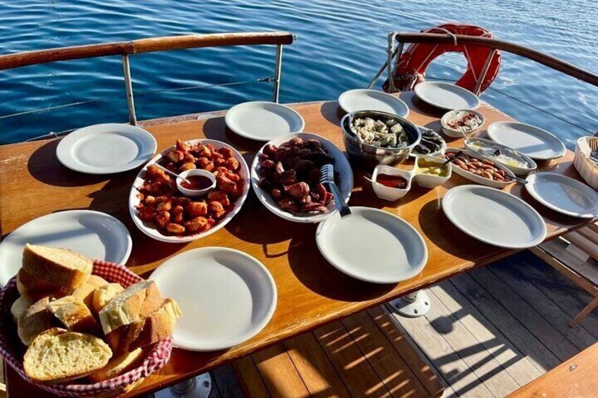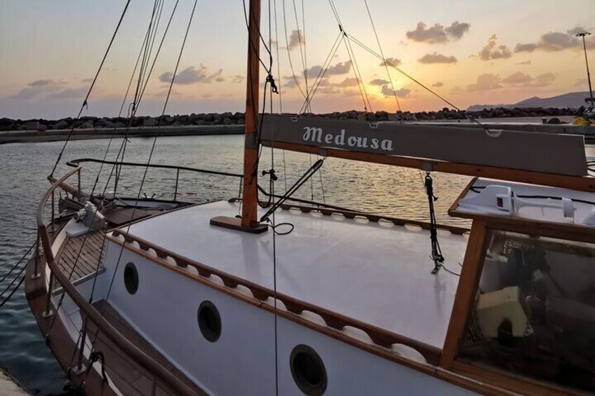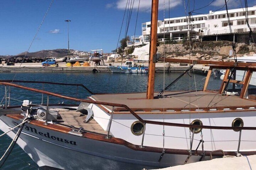 Croisière de 5h avec bateau traditionnel dans la Caldera. Déjeuner et boissons compris. Pick up de votre hotel.Max passagers 8!