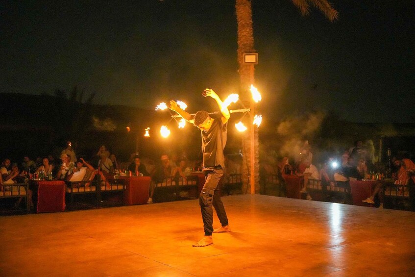 Cette option comprend 30 à 45 minutes de dune bashing en 4x4 Land Cruiser, une promenade à dos de chameau, du sandboarding, un arrêt pour les photos, et des activités telles que la danse du ventre, le Tanura et le spectacle de feu. Il comprend également un dîner barbecue privé ainsi que la prise en charge et le retour en voiture privée.