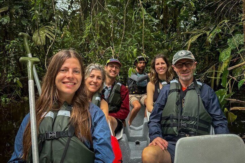 Excursion en canot au lever du soleil à Tortuguero – Café, jumelles et faune