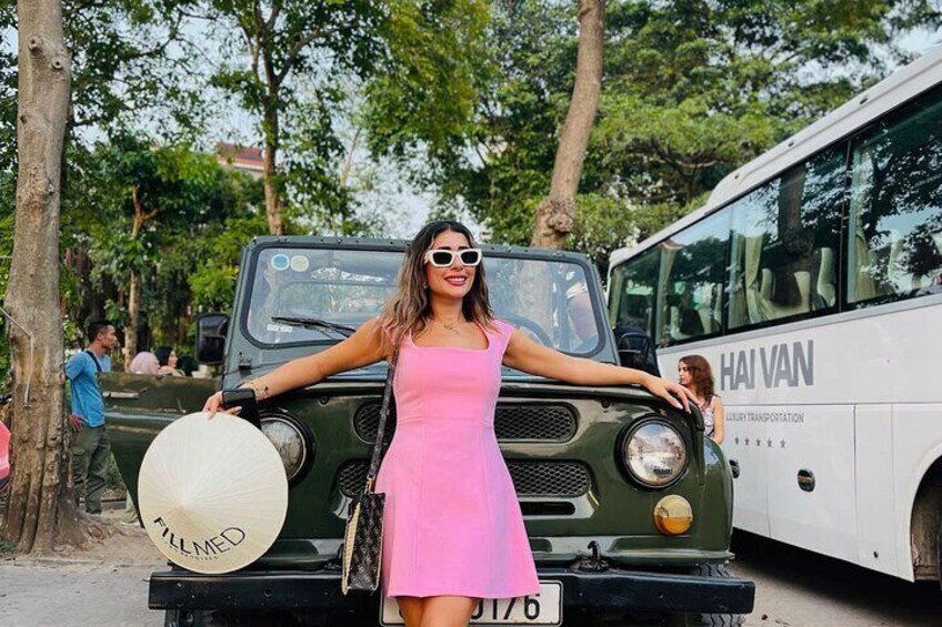 Partez pour un voyage exaltant à travers Hanoï à bord de la jeep légendaire du Vietnam, offrant une exploration unique de la dynamique capitale du Vietnam. Commencez par traverser l'emblématique pont Long Bien, symbolisant la résilience de la ville, et admirez la vue panoramique sur le fleuve Rouge.