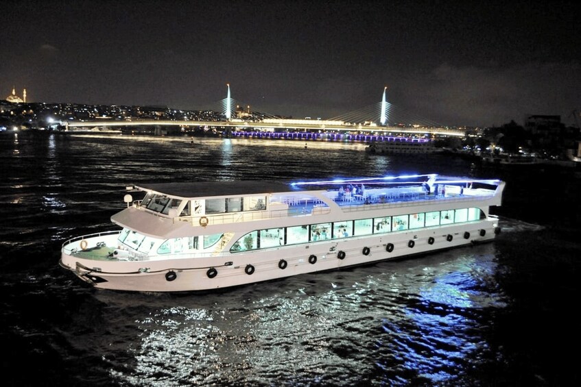 Comprend le menu du dîner VIP, les boissons non alcoolisées à volonté et les boissons alcoolisées de marque locale à volonté (vin, bière, rakı, vodka, gin) à une table privée dans le salon VIP sur le Bosphore. Les boissons alcoolisées importées sont en supplément. Transferts à l'hôtel inclus.