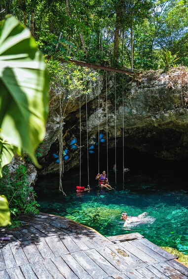 Vivez une expérience complète dans la jungle de Tulum en combinant la nature, la culture et la gastronomie en une seule expérience inoubliabl'excursion. Nagez dans deux magnifiques cenotes, l'un semi-ouvert entouré d'une végétation luxuriante et l'autre troglodyte avec d'impressionnantes formations rocheuses, offrant deux environnements complètement différents.